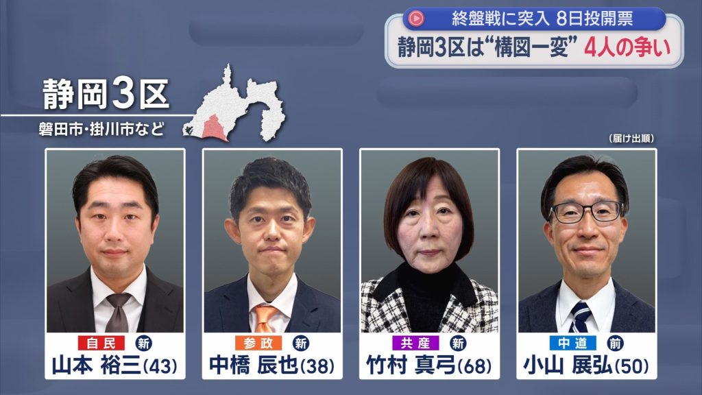 2/4 (水) 22:10- 【静岡3区】前回と構図一変 再度激突は中道と自民の2人 共産12・・・