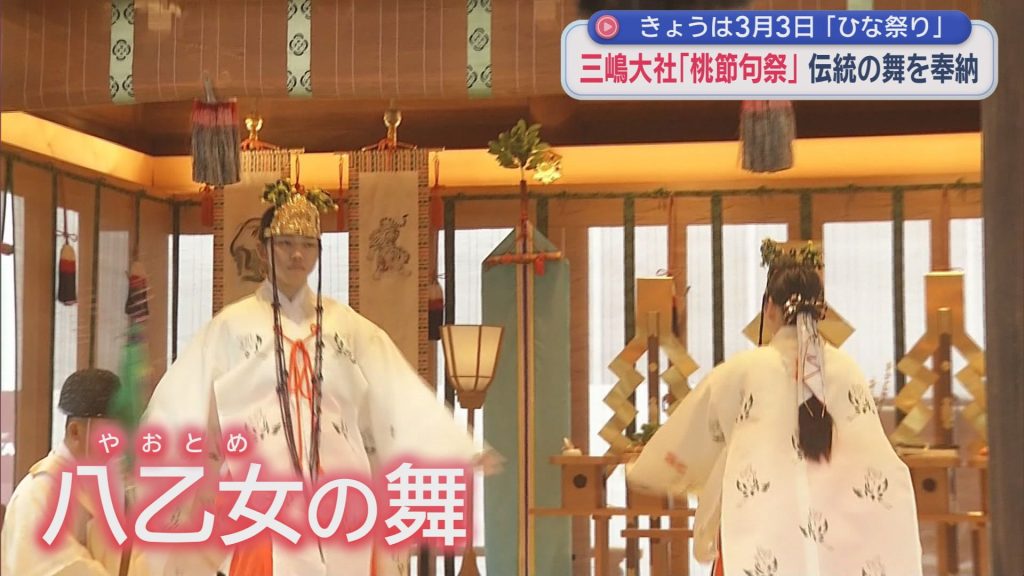 - 三嶋大社では伝統の「桃節句祭」 紅白の桃の枝を使って巫女ふたりが・・・