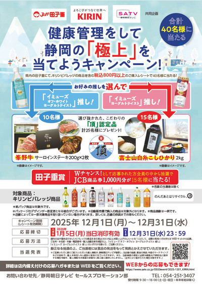 - 田子重にて、キリンビバレッジの商品を含むお買い上げ合計800円以上(税込)のご購入レシートを1口として応募すると、選び抜かれたこだわりの「頂」認定品の静岡の「極上」なプレゼントが抽選で当たります!!