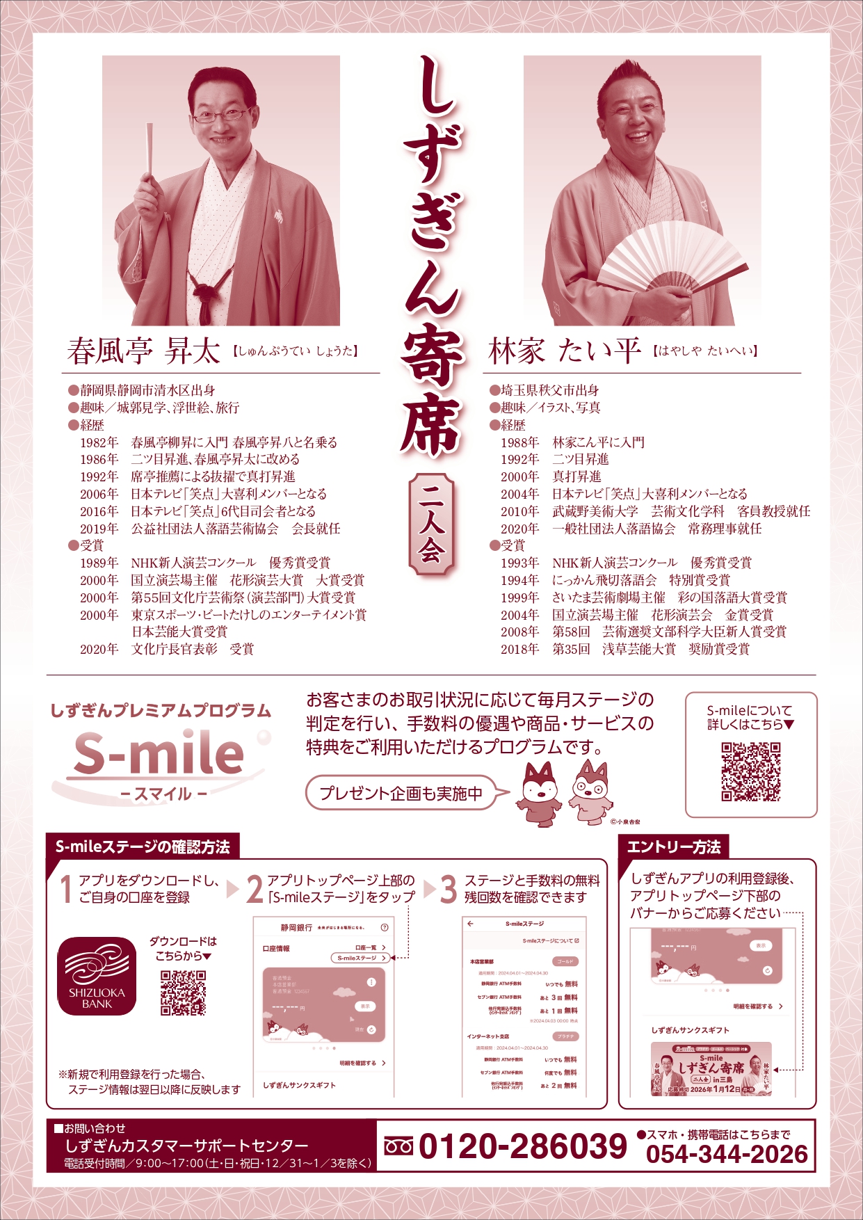 トップ > イベント・試写会・募集 > S-mile しずぎん寄席 春風亭昇太 林家たい平 二人会
